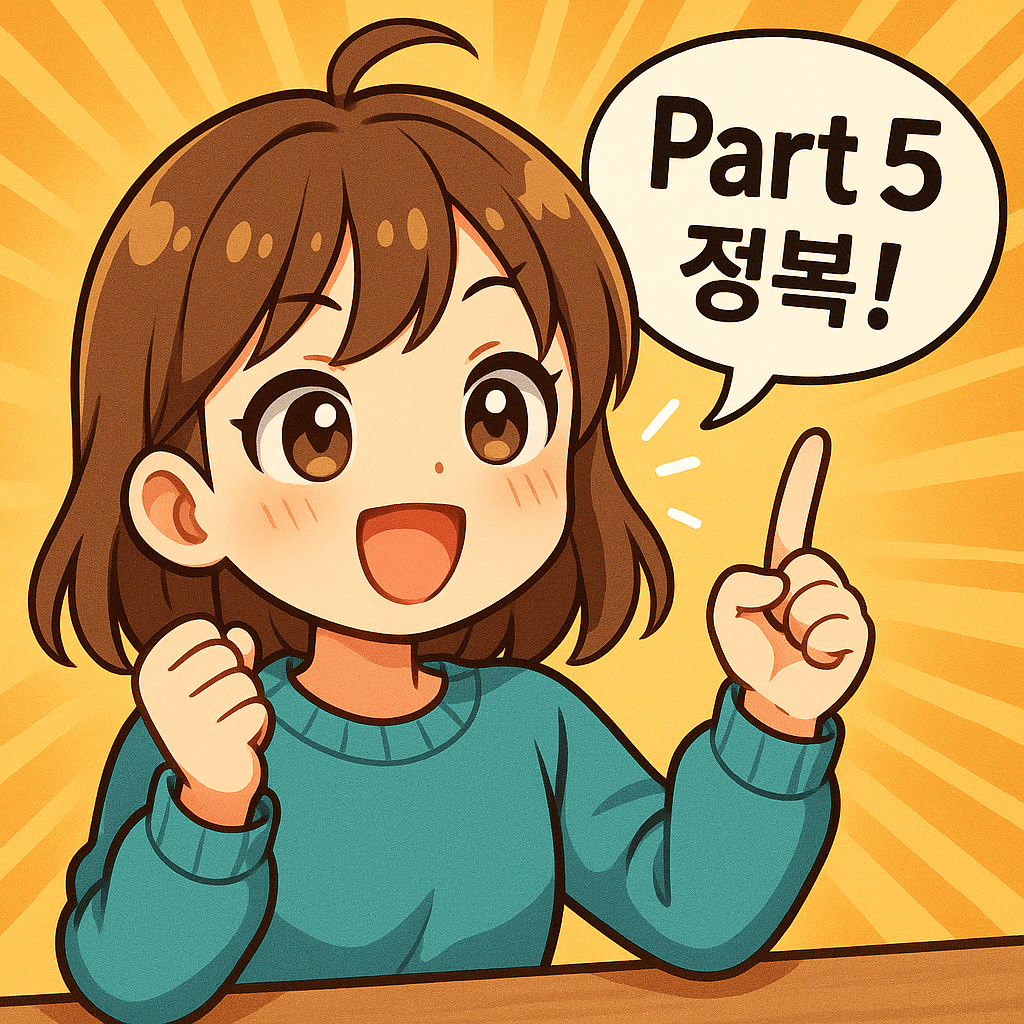어떠셨나요? 파트5, 이제 조금 자신감이 생기셨기를 바랍니다! 😊 오늘 배운 내용들, 특히 자주 나오는 짝꿍 표현(Collocation), 문장 구조 분석 방법, 그리고 헷갈리는 문법 포인트들을 다시 한번 복습하고 꾸준히 문제 풀이에 적용해 보세요. 작은 차이가 여러분의 파트5 점수를 크게 바꿀 수 있습니다! 여러분의 토익 목표 달성을 항상 응원합니다! 🎉